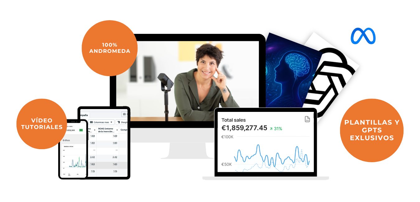 Incluye formación pionera en IA + ChatGPT para mejorar tus campañas de Meta Ads con GPTs exclusivos, calculadoras y mucho más.