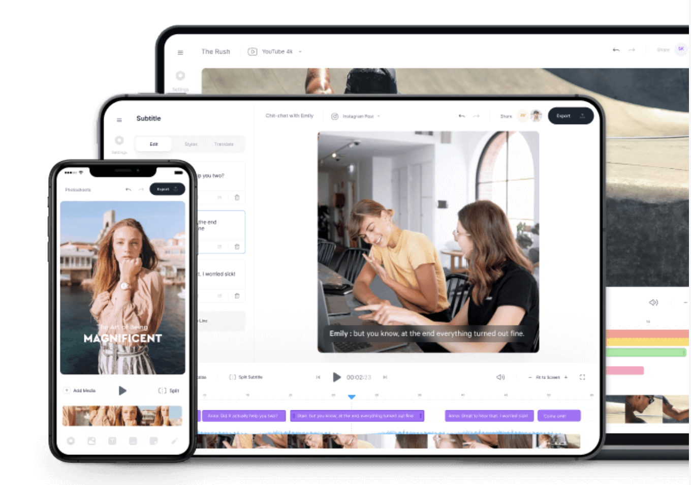 Veed te añade subtítulos de forma automática a tus vídeos, de manera que si necesitas publicar vídeos en los que haya voz en off o un interlocutor, puedes añadir subtítulos para que las personas que no tienen el sonido activado puedan igualmente leer el mensaje del anuncio o publicación.